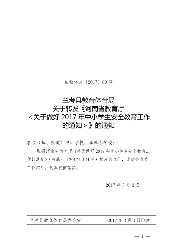 关于印发《兰考县2017年度学校安全工作方案》的